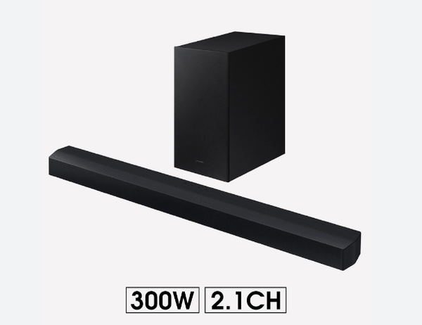 - Loa thanh Samsung có hệ thống âm thanh 2.1 kênh, tổng công suất 300W giúp tái tạo âm thanh mạnh mẽ, cuốn hút.