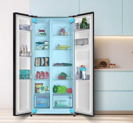 - Tủ lạnh sử dụng thiết kế Side by Side với chất liệu cửa tủ là kim loại phủ một lớp sơn tĩnh điện, phù hợp với các không gian nội thất như phòng khách và phòng bếp.
