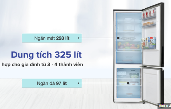 - Dung tích sử dụng 325 lít, đáp ứng nhu cầu lưu trữ thực phẩm của gia đình từ 3 - 4 thành viên hoặc gia đình ít thành viên hơn nhưng nhu cầu bảo quản thực phẩm cao.