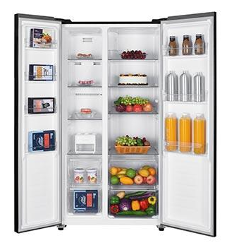 - Sharp Inverter 442 lít SJ-SBX440VG-BK được thiết kế theo mẫu tủ lạnh Side by Side với chất liệu cửa tủ kính màu đen. Điều này tạo nên vẻ đẹp sang trọng cho sản phẩm và có thể đặt ở bất kỳ vị trí nào trong không gian bếp hiện đại của gia đình.