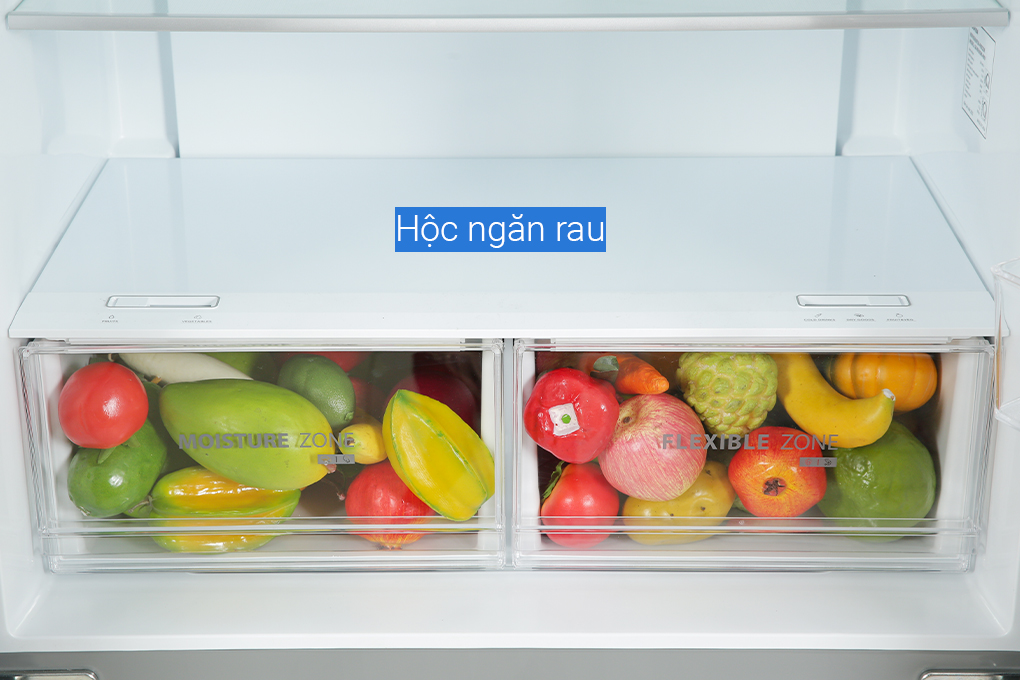 - Ngăn rau củ Moisture Zone: Giúp tăng cường và duy trì độ ẩm phù hợp, nhờ đó giữ được độ tươi ngon của rau củ quả, tránh tình trạng bị úng hoặc bị héo trong suốt thời gian bảo quản.