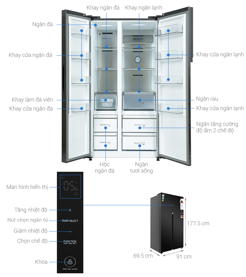 - Dung tích sử dụng 596 lít, thích hợp cho gia đình trên 5 thành viên hoặc gia đình có ít thành viên hơn nhưng với nhu cầu lưu trữ thực phẩm cao.